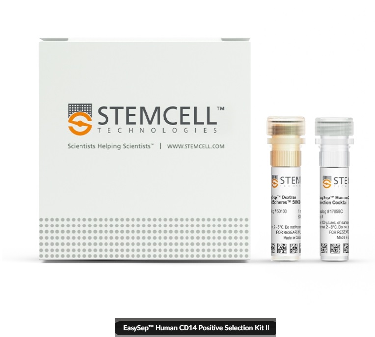 The EasySep™ Human CD14 Positive Selection Kit II is designed to isolate highly purified CD14+ cells from fresh or previously frozen human peripheral blood mononuclear cells (PBMCs). Desired cells are targeted with Tetrameric Antibody Complexes recognizing CD14 and dextran-coated magnetic particles. Labeled cells are separated using an EasySep™ magnet without the use of columns. Cells of interest remain in the tube while unwanted cells are poured off. The CD14 antigen is strongly expressed on monocytes and macrophages and weakly on granulocytes. It is also expressed on most tissue macrophages.